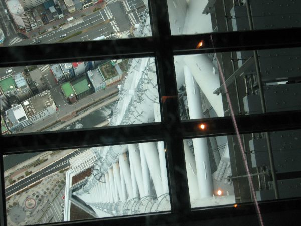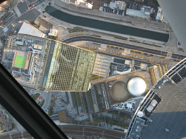 450mの展望台から上から下を見下ろす。右端が350mの展望台。左側はイーストタワー。その間の白い丸はプラネタリウムの屋根。