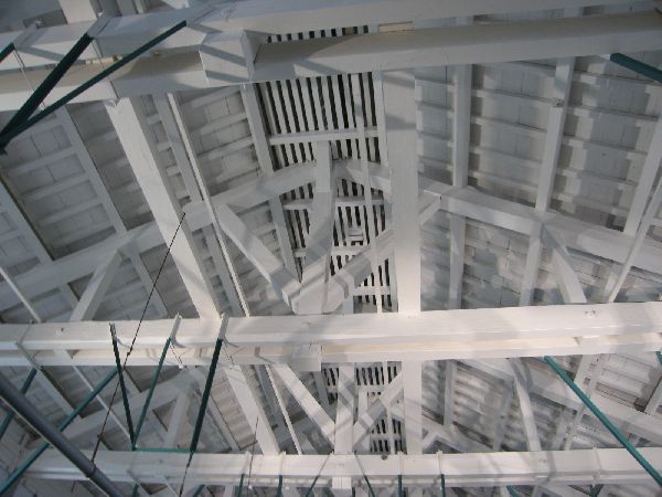 その中の屋根の構造。トラフ構造という三角の造りが特徴的らしく、このおかげで柱が下までなくて大きな空間を確保できたらしい。